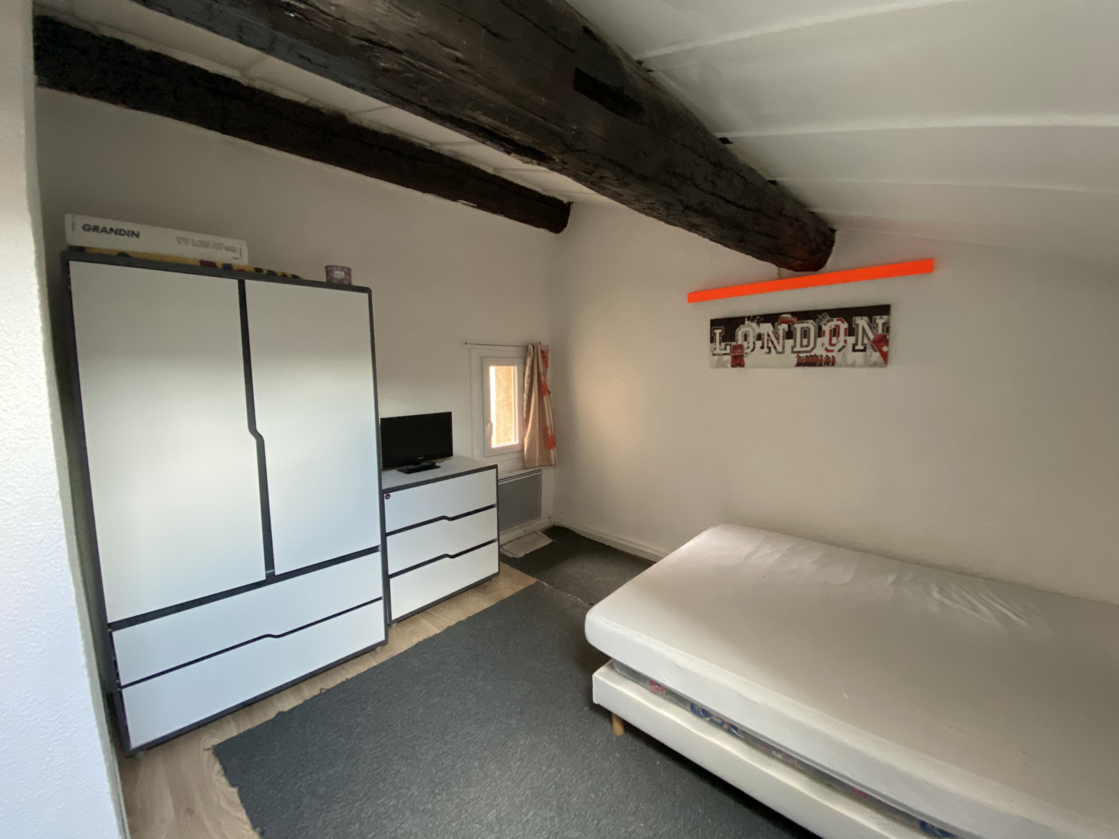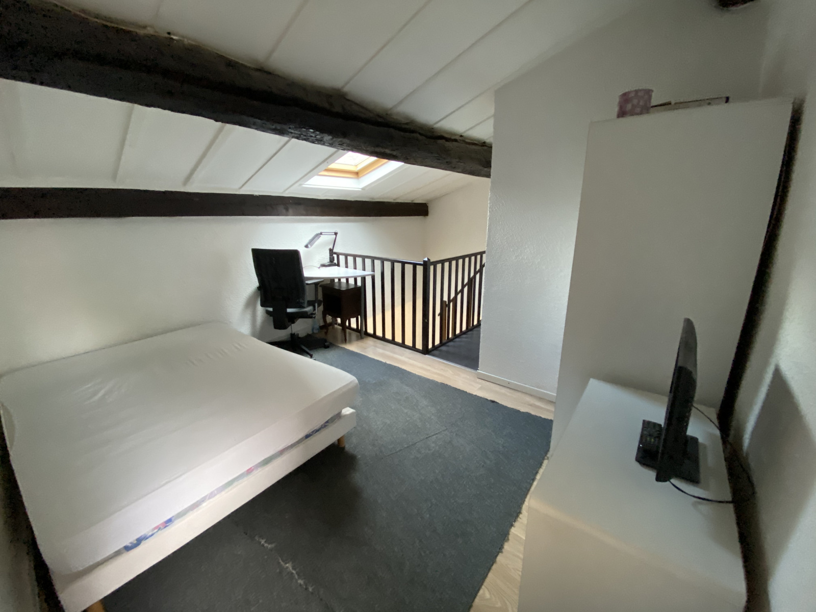 Il se compose au rdc d’une pièce de vie avec cuisine équipée et d’une mezzanine qui distribue une salle de bain avec wc ainsi qu’une chambre lumineuse (fenêtre + Vélux) avec parquet.