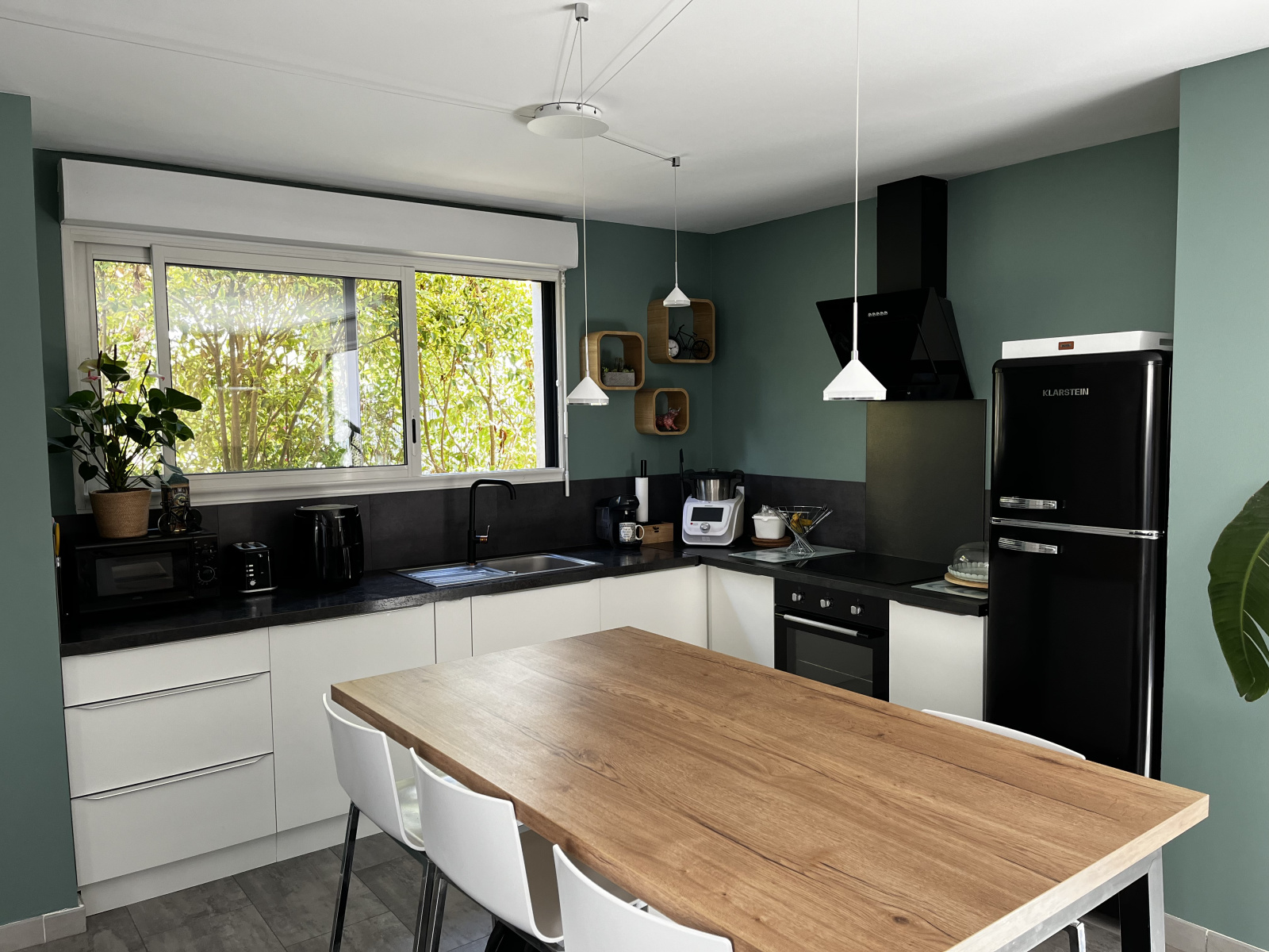 Au rez-de-chaussée, vous trouverez une pièce de vie comptemporaine de 43 m2, avec une cuisine toute équpée d'électoménagers de qualité ainsi qu'une suite parentale de 18 m. Le tout donnant sur une terrasse pensée pour des moments privilégiès en famille ou de détente.